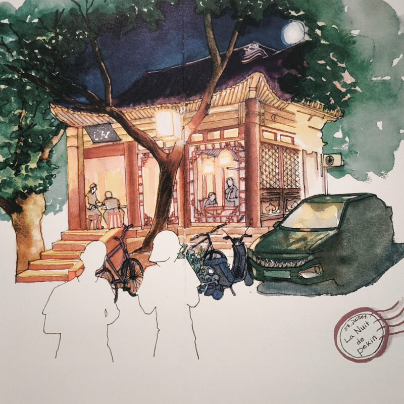 Ces carnets sont réalisés sur place, sans préparation. On s’installe, on ouvre le carnet, on commence. Un musée, une gare, un café, un restaurant : peu importe le lieu. Ce qui nous intéresse, c’est la manière dont l’espace tient dans la page. La perspective déborde parfois. Les lignes hésitent. Le bruit traverse le dessin. Nous travaillons avec ce que nous avons sous la main — encre, crayon, aquarelle. Les médiums se superposent, se corrigent, dialoguent.